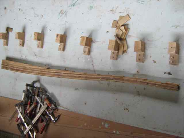 The shape drawn on the plywood boatshed floor, and the clamping blocks screwed in place, the lamells are laid out in order. Note that the tiller is much deeper at one end and finer at the handle end, so there are more layers at the “thick” end, no need to have it the same depth all the way. I’m read to start applying glue.