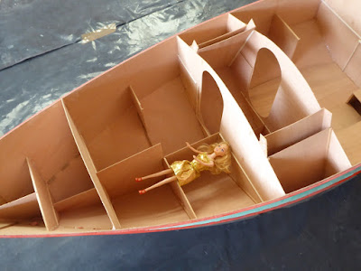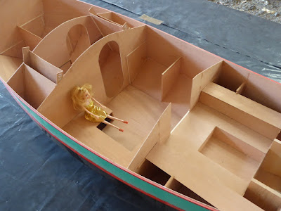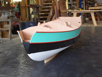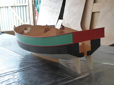 I love Fantail, of course, but North Island is an area with lots of shallow water, and I want a boat that can take advantage of this. In addition, Fantail is now 30 years old and I don’t really want to be maintaining a boat of this era in another 15 years. So I’ve decided to build my perfect boat, which, hopefully, will see me out. Below is an impression of the finished boat (although mine will be painted in different colours) and a photograph of the model that my friend, David, who designed the boat, and I made. The blonde lady represents me: she is the right height in her high heels and including the topknot, but the rest of the proportions are a bit iffy!) David is helping me in the early stages, before sailing off over the horizon leaving me to carry on alone. But I have heaps of supportive friends, here, so feel fairly confident that when I need a second pair of hands, there will be someone I can call on.