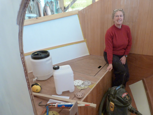 The view from forward through the main cabin to to cockpit, lots of work to do there as yet but progress is being made. The dink on the back wall of the shed is my “Offcuts” design, the predecessor to “Scraps”.