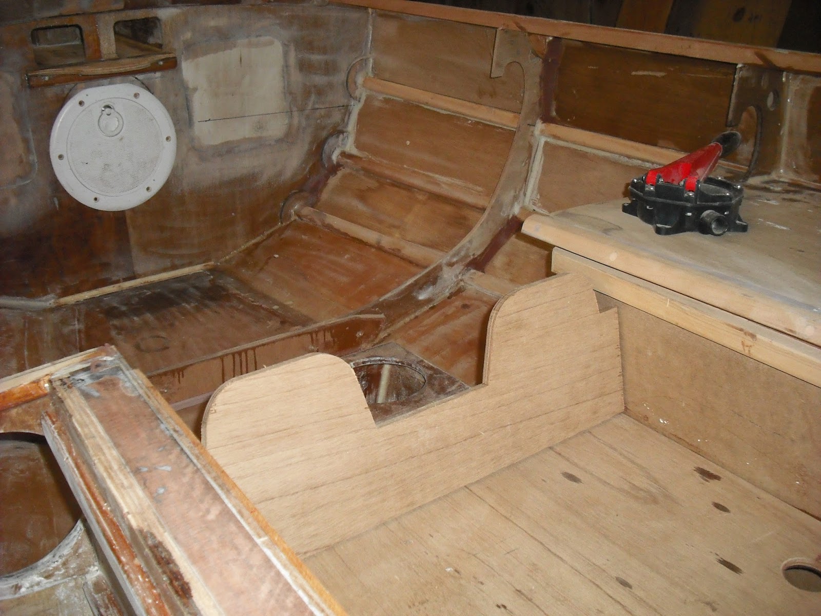 Yes, I changed my mind, filled original pair of hatch holes back up and hacked out a central one. The anchor locker will be just below that white hatch and come out just into where the old hatch openings that you can see are. The seats will go from the walls of that out on the level of the black line you can see out on the right of the pic. The “tongue” sticking out is the lower support for the tiller pivot pin.