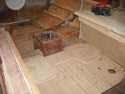 The rowing footrest, just rough cut at this stage, will be hinged to that removable deck over the footwell, and it is to be supported by the compass binnacle in the middle, and a pair of cleats on the seat fronts. Rowing without footrests is not really much fun, but permanently mounted rests would be in the way when sailing. Hence the fold down setup.