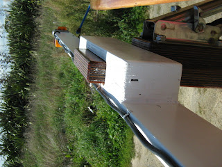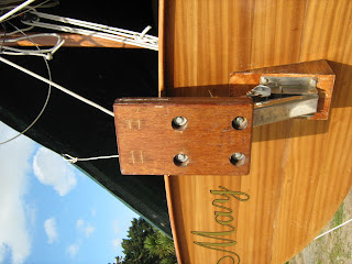 I’d recently changed the woodwork on the bracket, it had been such that the power head of the outboard motor had not sufficient clearance from the transom to allow it to be easily operated so I’d made a new wooden pad that moved the motor out 20mm and up 50mm which made life very much easier when using the little 3 hp longshaft Tohatsu. ( I’ll tell you about that motor another time, I’m quietly reasonably impressed with it.) That meant that the top edge of the motor pad formed a 180mm wide, 36mm thick tongue sticking up 120mm from the metal part of the rise and fall bracket.