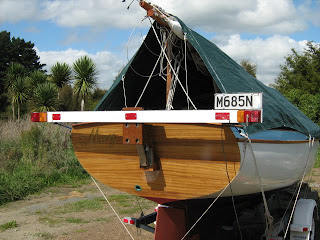I added some reflectors so it will be more easily seen by following cars, stabilized the rig with a couple of shock cords through the fairleads on the stern quarters to the mooring cleats, run the cable to the car along the side decks inside the sheet and stay points and out through the bow fairleads, through the trailer winch post and thence to the car, all nice and secure but will only take a couple of minutes to rig.