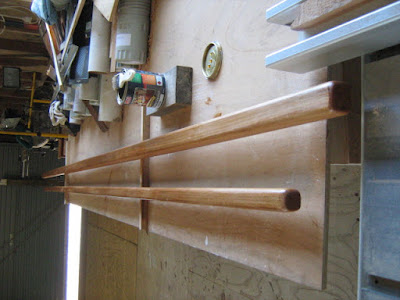 The two pieces on the right are the boom on the right, the yard on its left. The pieces cut from the ends will come in handy somewhere in the next build, you’d be suprised at how much wood you can soak up in small pieces when making up cleat stock and grounds for frames and seating.