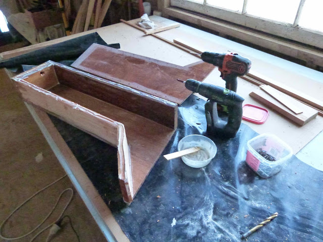 This is the mainmast box. Its been carefully coated with three coats of epoxy, all the seams pre primed, and the corners filleted with a small glue fillet, the drain hole drilled and sealed, and the drain fitting screwed into the bottom the mast step box ready to put the last side on. From here its “let the glue go off, sand its outside corners rounded and then put it in place.