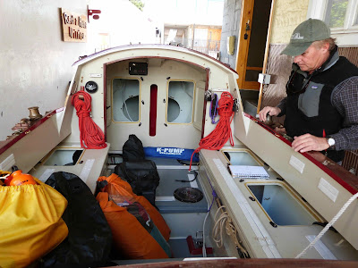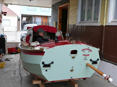 Seat cushions in place, the secondary anchors being rigged in their bags, hiking footstrap in place and most of the canvaswork fitted. The blue item is a folding seat padded too. Look comfortable? This will be Howards home for up to 3 months, and that in near Antarctic conditions!