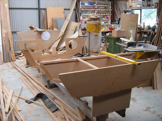 Blair and I got the hull done, stitch and tape is not my favourite way of building and the cheap plywood did not bend as fairly as I’d like but the boat will work ok all the same. Blair has had “life” happen to him, and the project is sitting while he is away out of the country working so we’ve not seen her in the water as yet. But I had all the frame templates, my tidy up revealed that I had half a dozen sheets of plywood, a heap of various bits of wood, and a whole lot of epoxy.