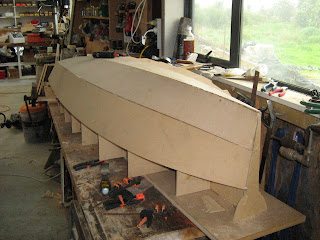 From the drawing I built this planking model, its 1/10 scale so is about 1.3m ( 4ft 4in ) long, planked up with doorskin MDF its accurate to about 2mm or so and the panel shapes were taken off and scaled up.