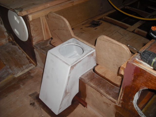 The compass binnacle, it hides the scupper into the footwell ahead of it, plus supports the rowing footrest ahead of it. That footrest will be hinged to fold down flat to enable me to move back and forth past it without tripping over it.