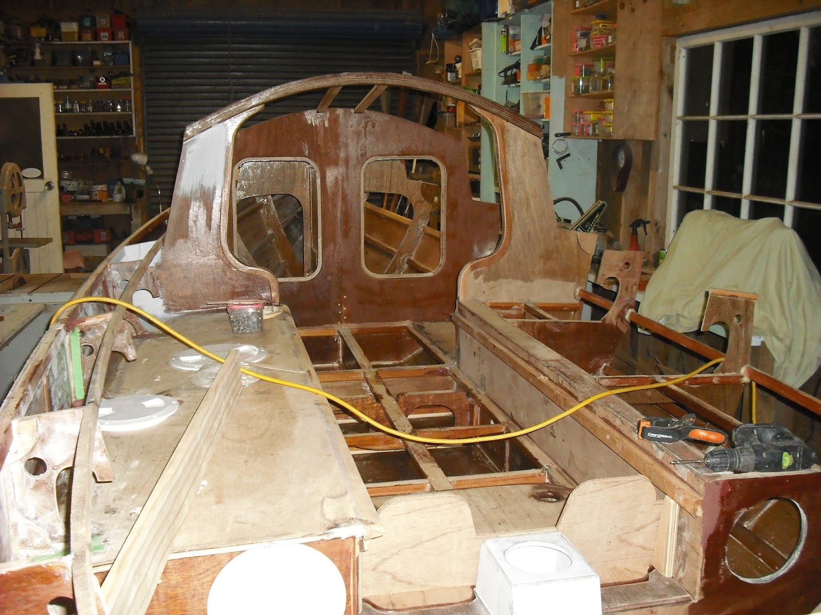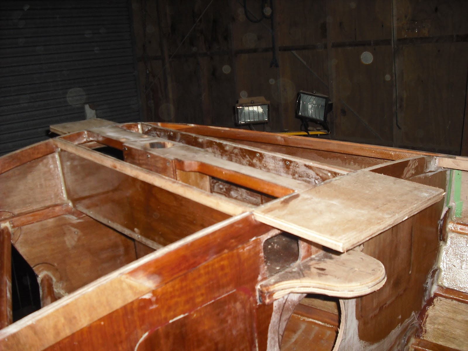 Note that the cockpit floor doesn’t get fitted until the boats been rolled over and the skeg fitted. While she’s upside down the bottom will be fiberglassed and she’ll be painted up to the gunwale. I’m not looking forward to the job of flipping her, but it will happen, the plan is to suspend her at each end from the rafters and just spin her, then sit her on some padding of some sort.