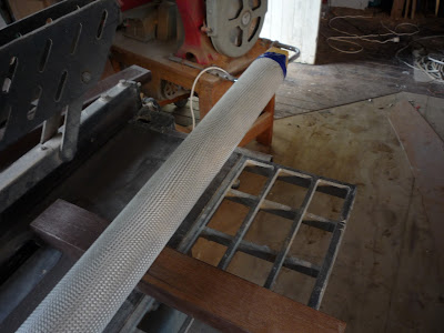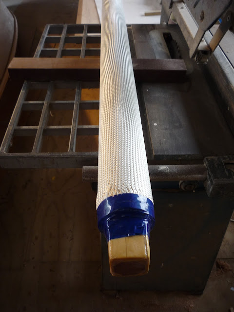 woven fiberglass sleeve to reinforce the wooden masts he’s made for the various