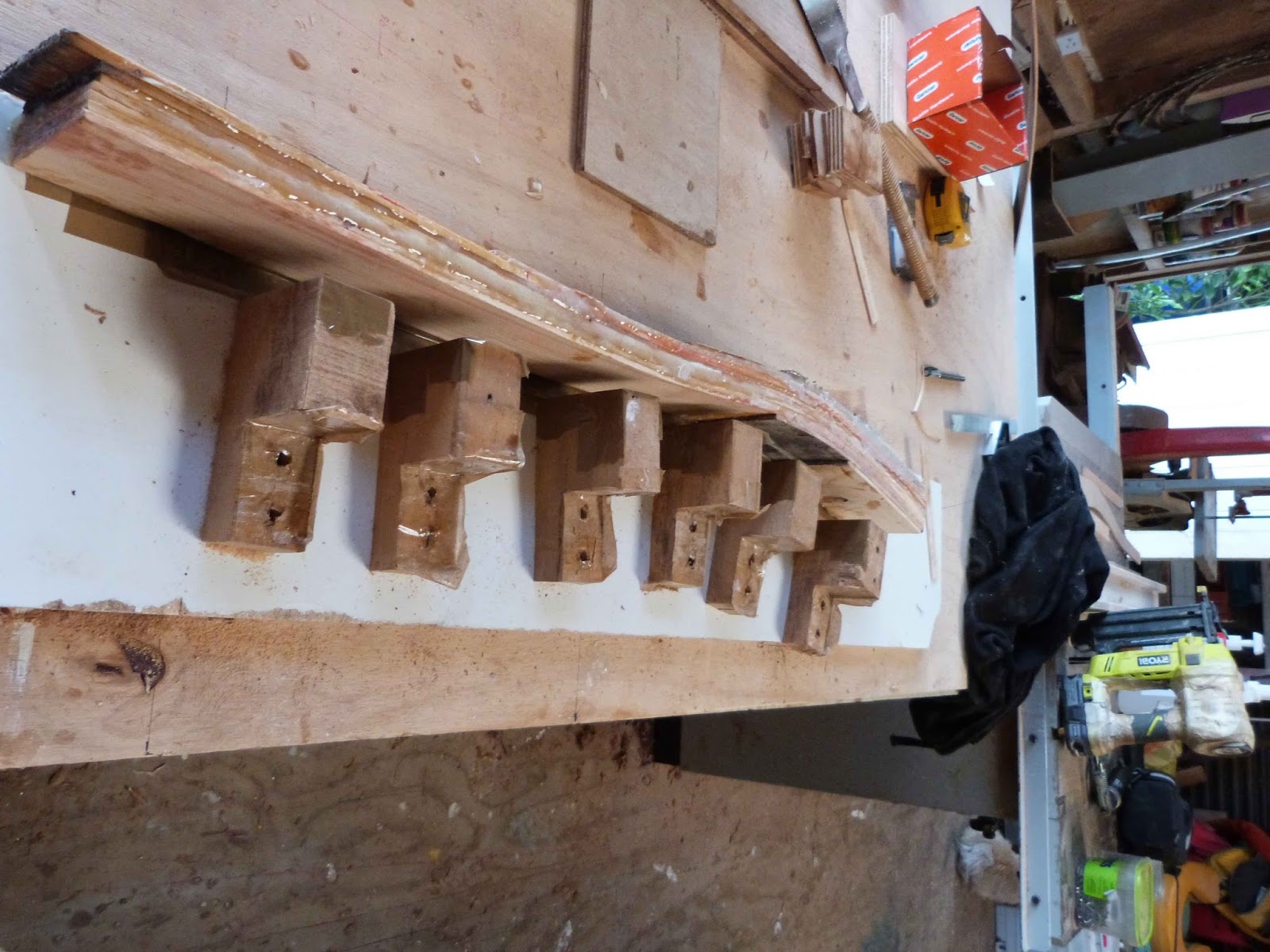 The last 5 on, doing 12 in one shot is fussy work, every piece is trying to escape, all slippery with epoxy and under tension, so I’ve done it in two stages, the first layup having enough pieces to stop any springback when the clamps come off, then next day, after a bit of a cleanup to take any lumps of glue off, the rest get coated and clamped on.